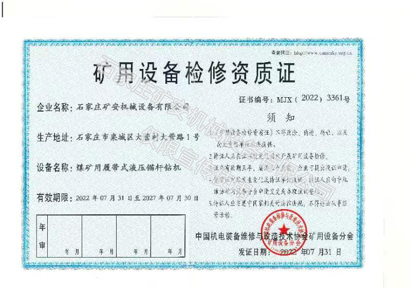 石家莊礦安機械設備有限公司成立于2011年3月,公司位于風景優(yōu)美、科技發(fā)達、交通便利的石家莊市欒城區(qū),是一家專注生產(chǎn)煤礦井下支護機具(錨桿鉆機)和安全鉆機(防突,架柱等)及氣動隔膜泵等礦用機械設備的********,是國內(nèi)煤礦機械裝備的生產(chǎn)商和服務商,根據(jù)用戶需求提供井下適用的鉆機施工解決方案。公司致力于打造研發(fā)、制造、銷售、服務為一體的現(xiàn)代化企業(yè),全心全意為煤礦生產(chǎn)保駕護航。 ? 公司建有裝配車間、機加車間和調(diào)試車間,擁有嚴格的質(zhì)量控制體系、先進的產(chǎn)品開發(fā)系統(tǒng)、完善的試驗檢測設施、良好的售后服務保障。先后與中煤科工集團沈陽研究院、西安研究院、太原理工大學、燕山大學等知名院校建立了緊密的合作關(guān)系。 ? 公司產(chǎn)品主要銷往山西、陜西、山東、內(nèi)蒙古、黑龍江、云南、貴州等七十多個礦區(qū)和地方煤礦,擁有一支成熟的售后技術(shù)團隊,并且和中煤集團、華電煤業(yè)集團、華潤煤業(yè)集團、潞安集團、山西焦煤、淮北礦業(yè)等國內(nèi)知名企業(yè)達成長期合作關(guān)系。 ? 公司始終秉持“讓煤礦生產(chǎn)更安全”的發(fā)展使命,力求誠信與創(chuàng)新,追求卓越與完美,深知“實實在在、心無旁騖做實業(yè)”,這才是本分!石家莊礦安機械設備有限公司愿與您攜手共進,共同發(fā)展!為客戶創(chuàng)造價值,提供優(yōu)質(zhì)的產(chǎn)品和*佳的服務是我們永無止境的理念!